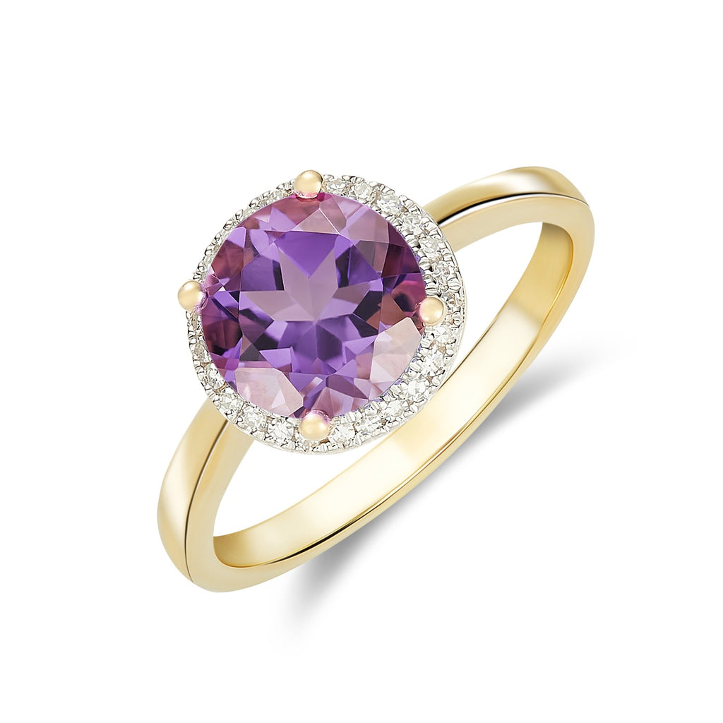 9CT Yellow Gold Round Amethyst & Diamond Cluster Ring 8mm
