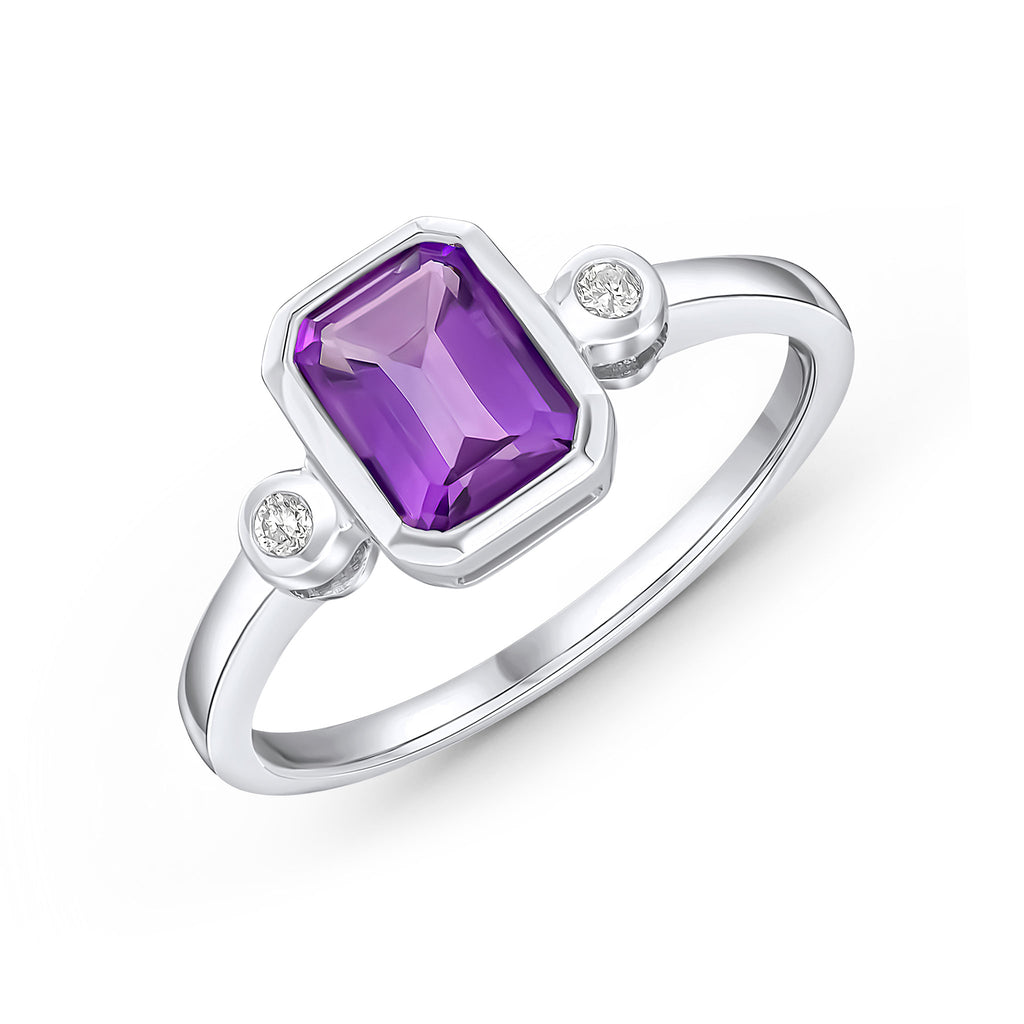 9CT White Gold Octagonal Amethyst & Diamond Three Stone Ring 7x5mm