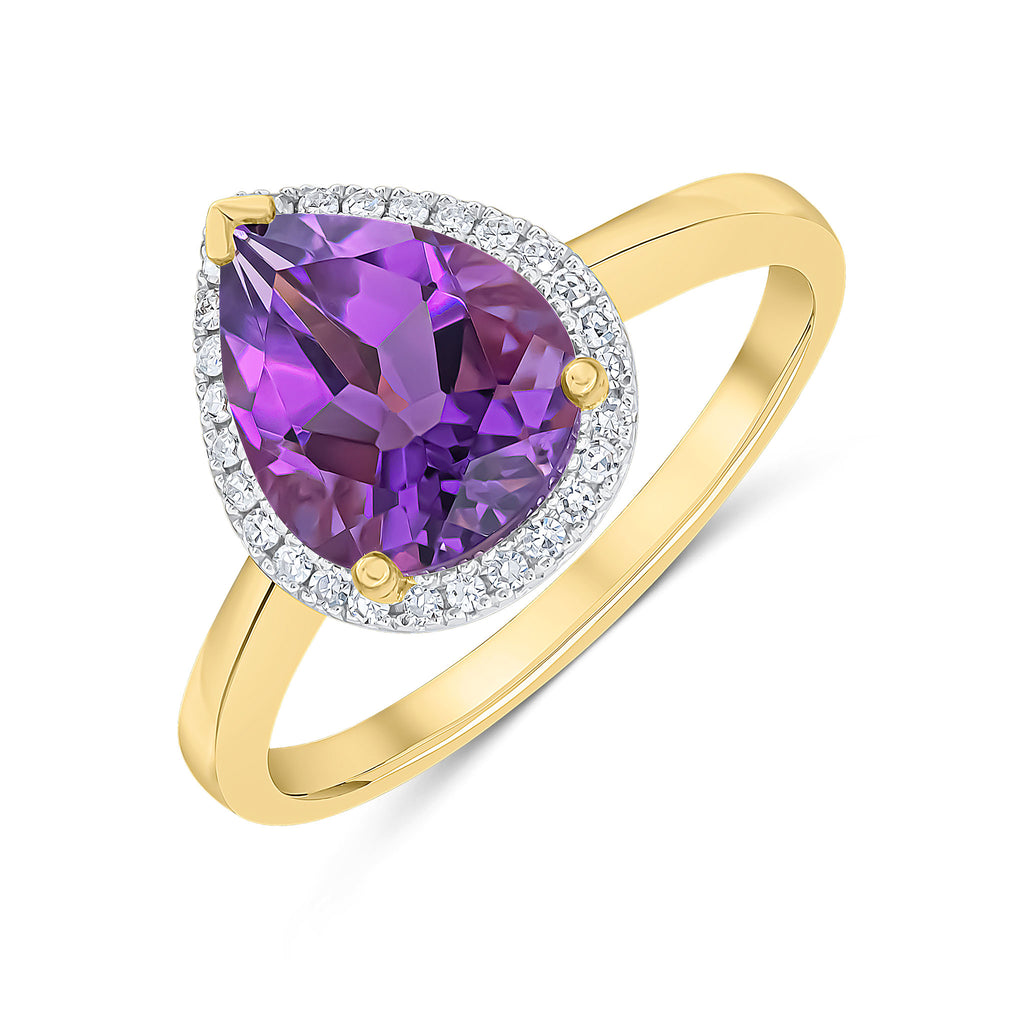 9CT Yellow Gold Rubover Pear Shaped Amethyst & Millegrain Diamond Cluster Ring 7x5mm