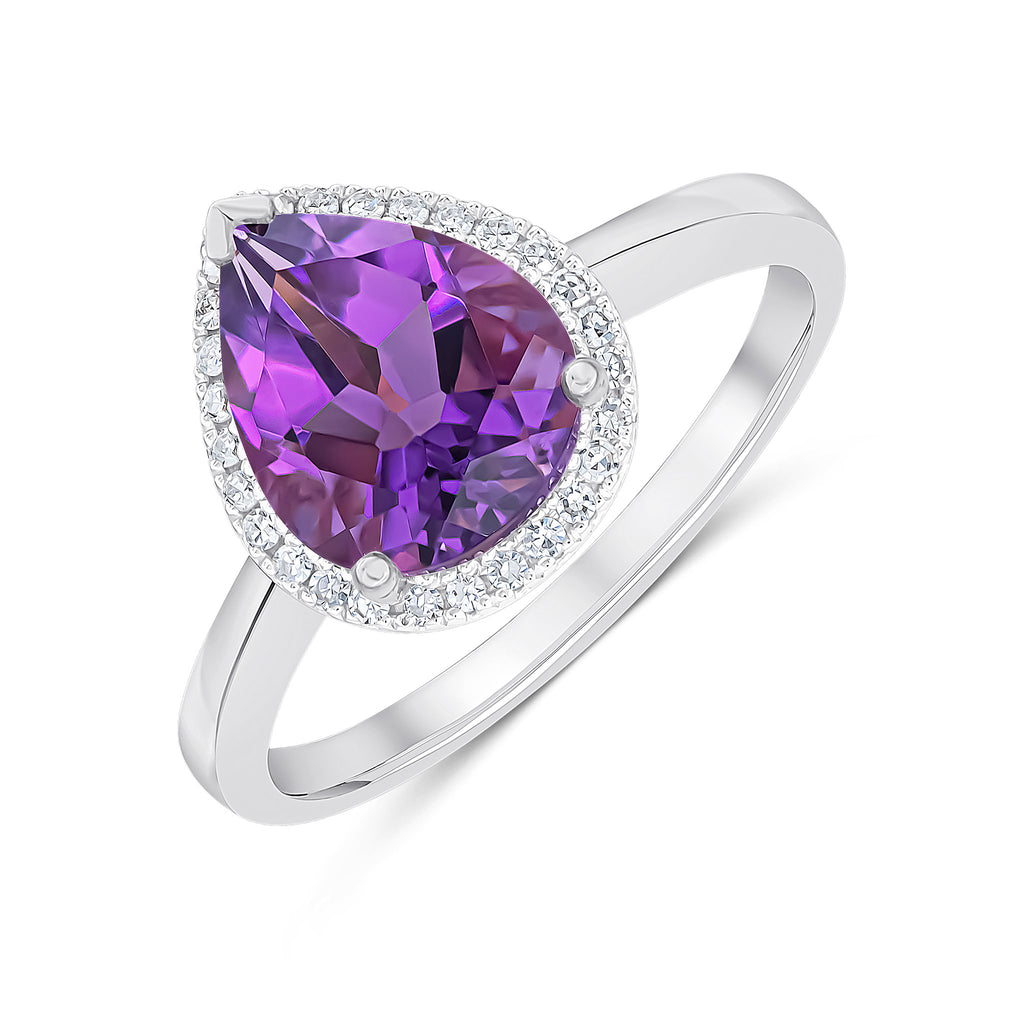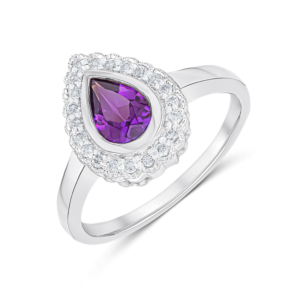 9CT White Gold Rubover Pear Shaped Amethyst & Millegrain Diamond Cluster Ring 7x5mm