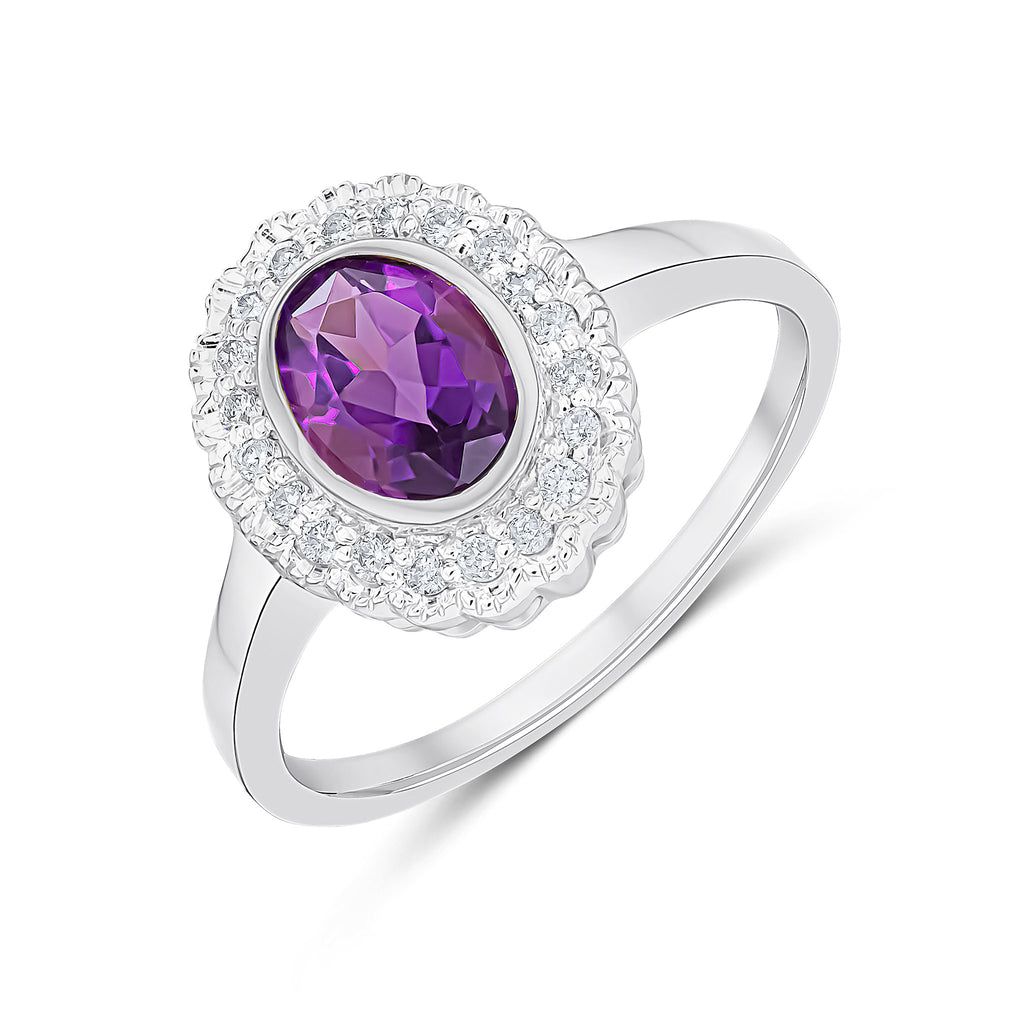 9CT White Gold Rubover Oval Amethyst & Millegrain Diamond Cluster Ring 7x5mm