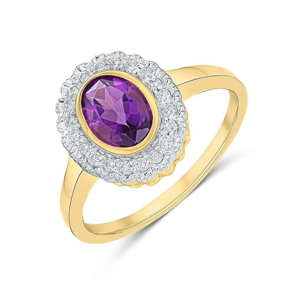 9CT Yellow Gold Rubover Oval Amethyst & Millegrain Diamond Cluster Ring 7x5mm