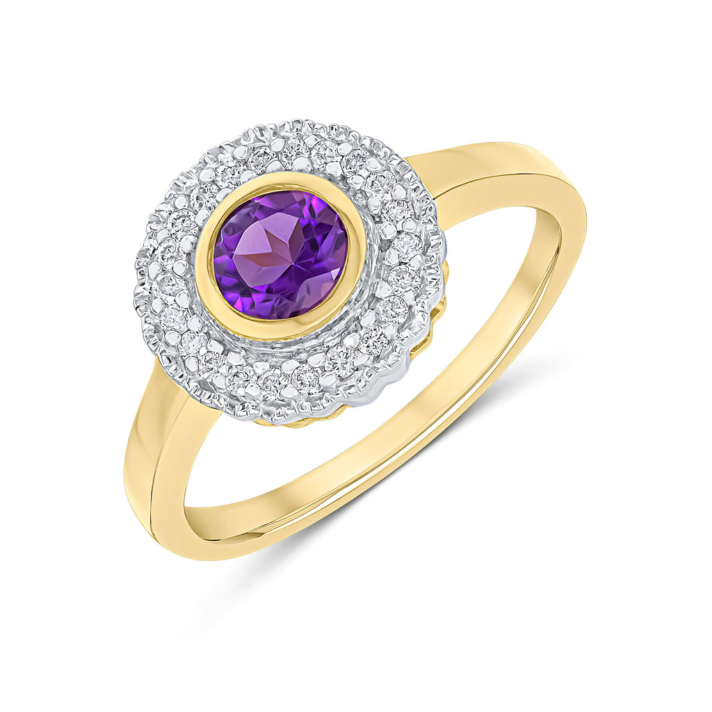 9CT Yellow Gold Round Rubover Amethyst & Millegrain Round Diamond Cluster Ring 5mm