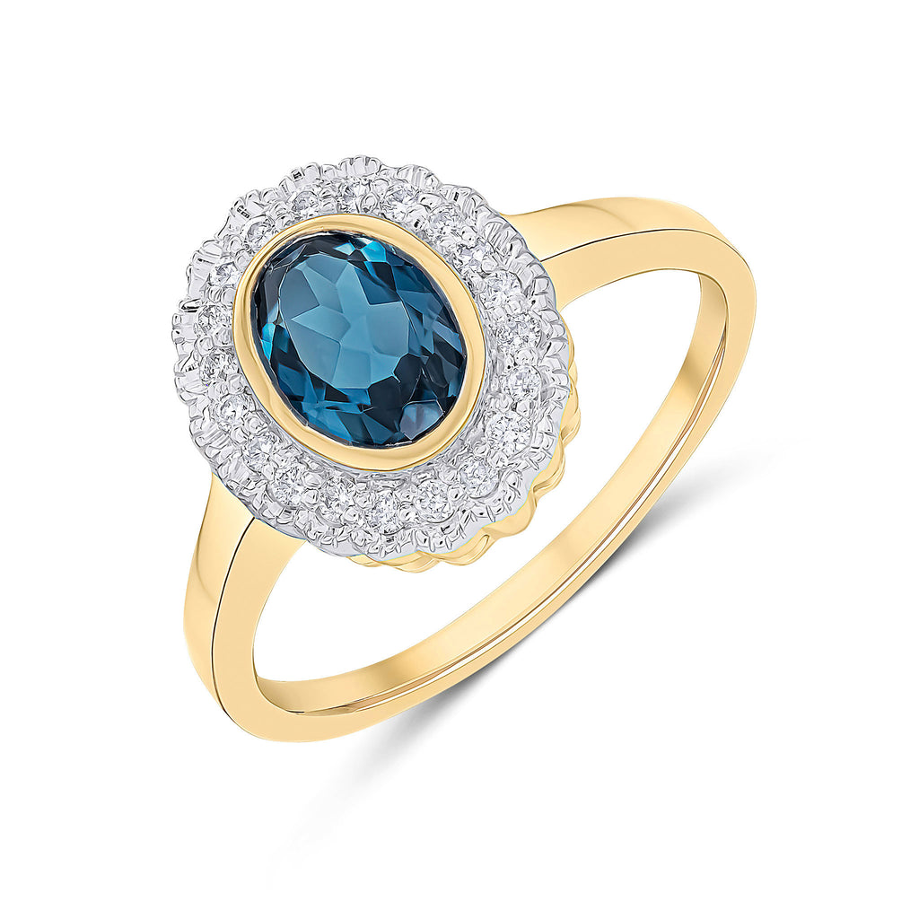9CT Yellow Gold Rubover Oval London Blue Topaz & Millegrain Diamond Cluster Ring 7x5mm