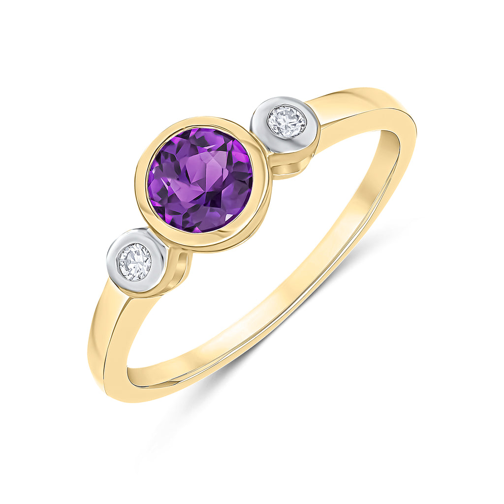 9CT Yellow Gold Round Rubover Amethyst & Diamond Three Stone Ring 5mm