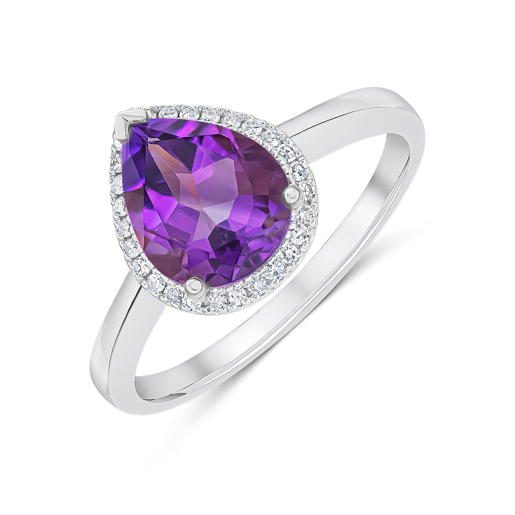9CT White Gold Pear Shaped Amethyst & Diamond Ring 14x9mm