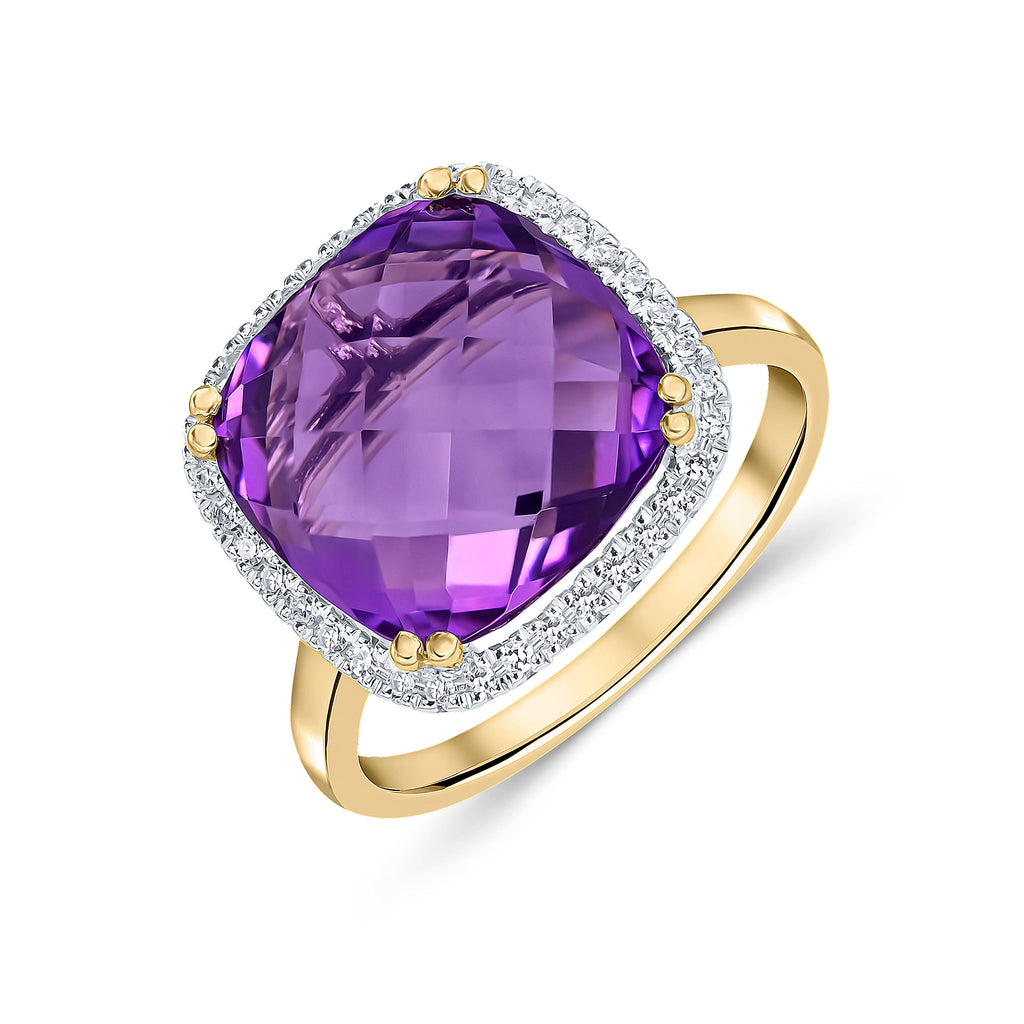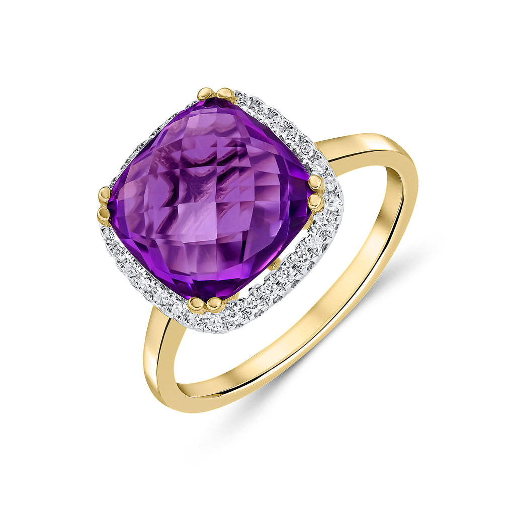 9CT Yellow Gold Cushion Amethyst & Diamond Cluster Ring 10mm