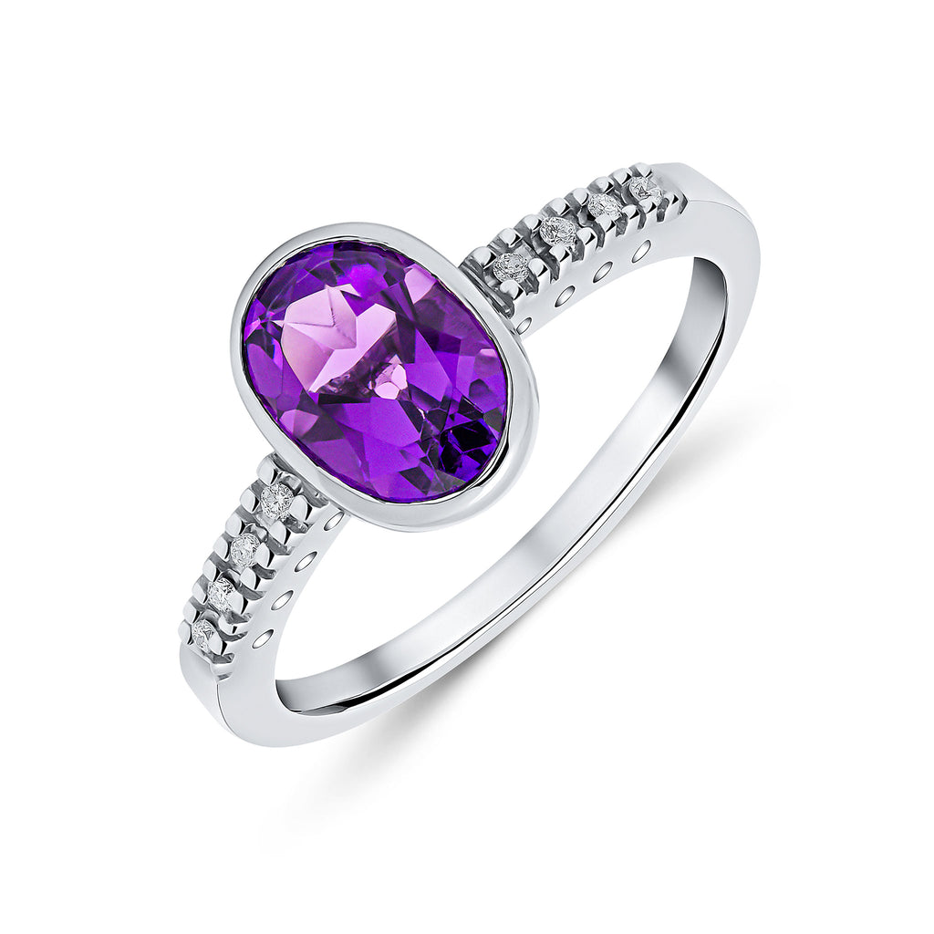 9CT White Gold Oval Rubover Amethyst Ring with Diamond Shoulders 8x6mm