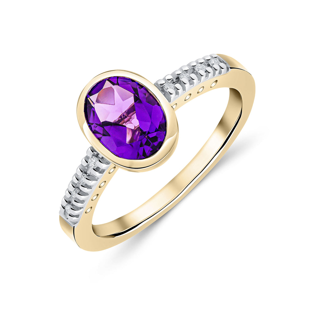 9CT Yellow Gold Oval Rubover Amethyst Ring with Diamond Shoulders 8x6mm