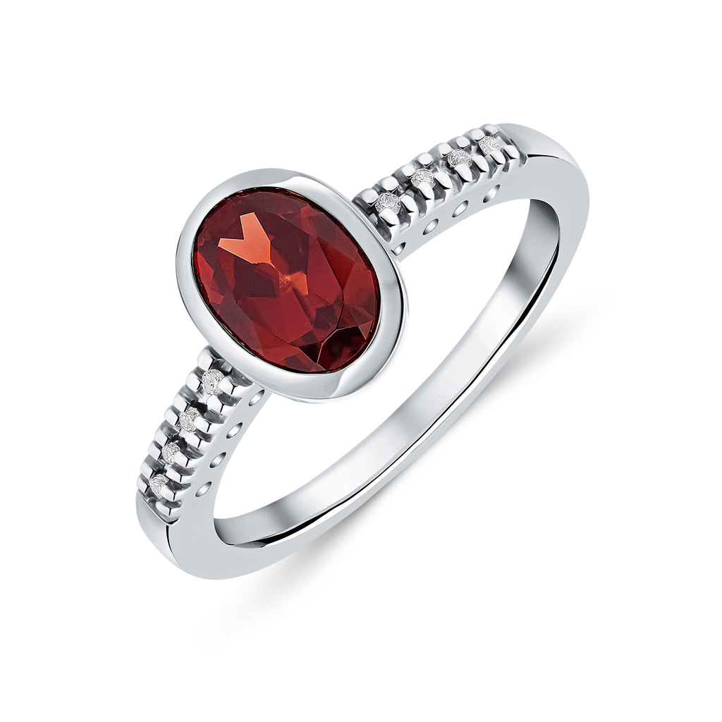 9CT White Gold Oval Rubover Garnet Ring with Diamond Shoulders 8x6mm