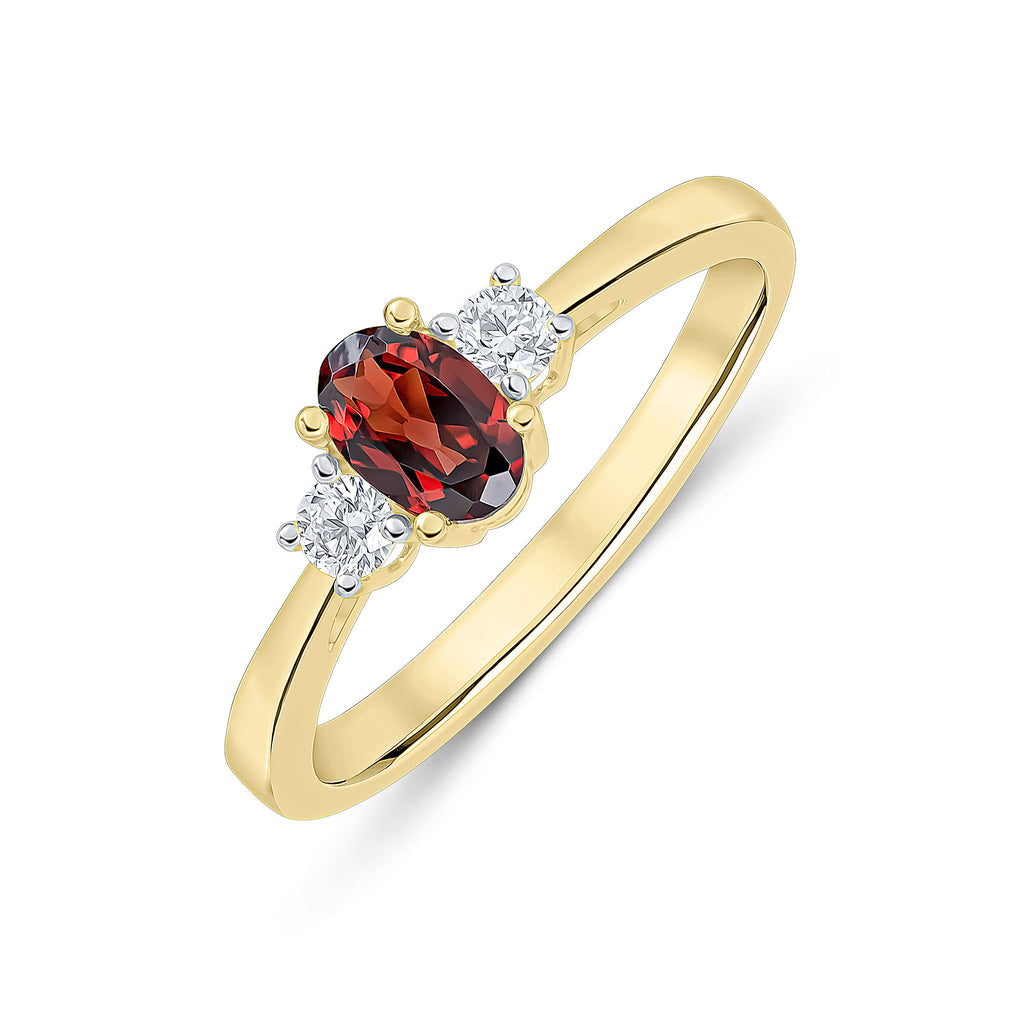 9CT Yellow Gold Oval Garnet & Round Diamond Claw Three Stone Ring 6x4mm