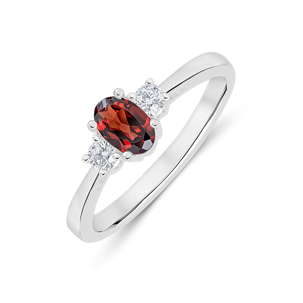 9CT White Gold Oval Garnet & Round Diamond Claw Three Stone Ring 6x4mm