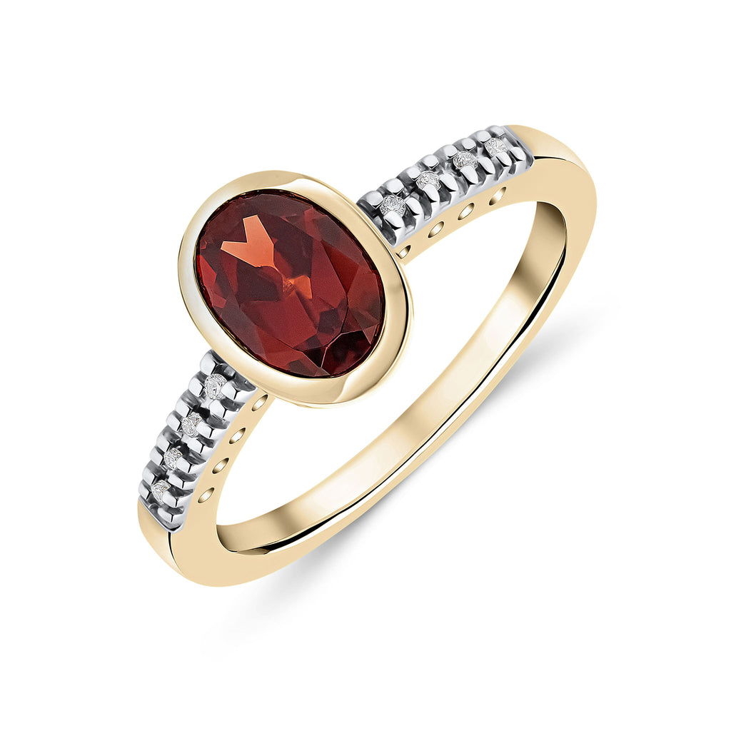 9CT Yellow Gold Oval Rubover Garnet Ring with Diamond Shoulders 8x6mm