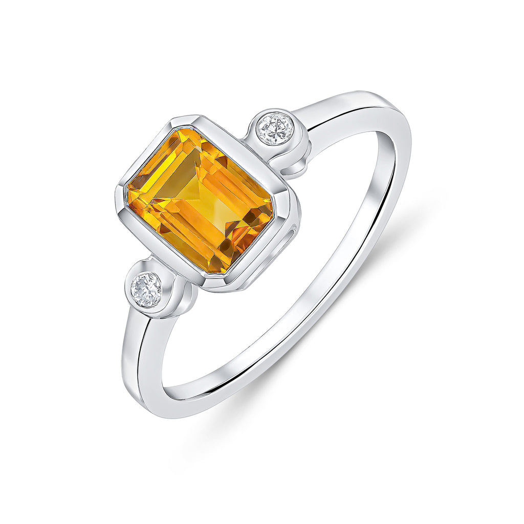 9CT White Gold Octagonal Citrine & Diamond Three Stone Ring