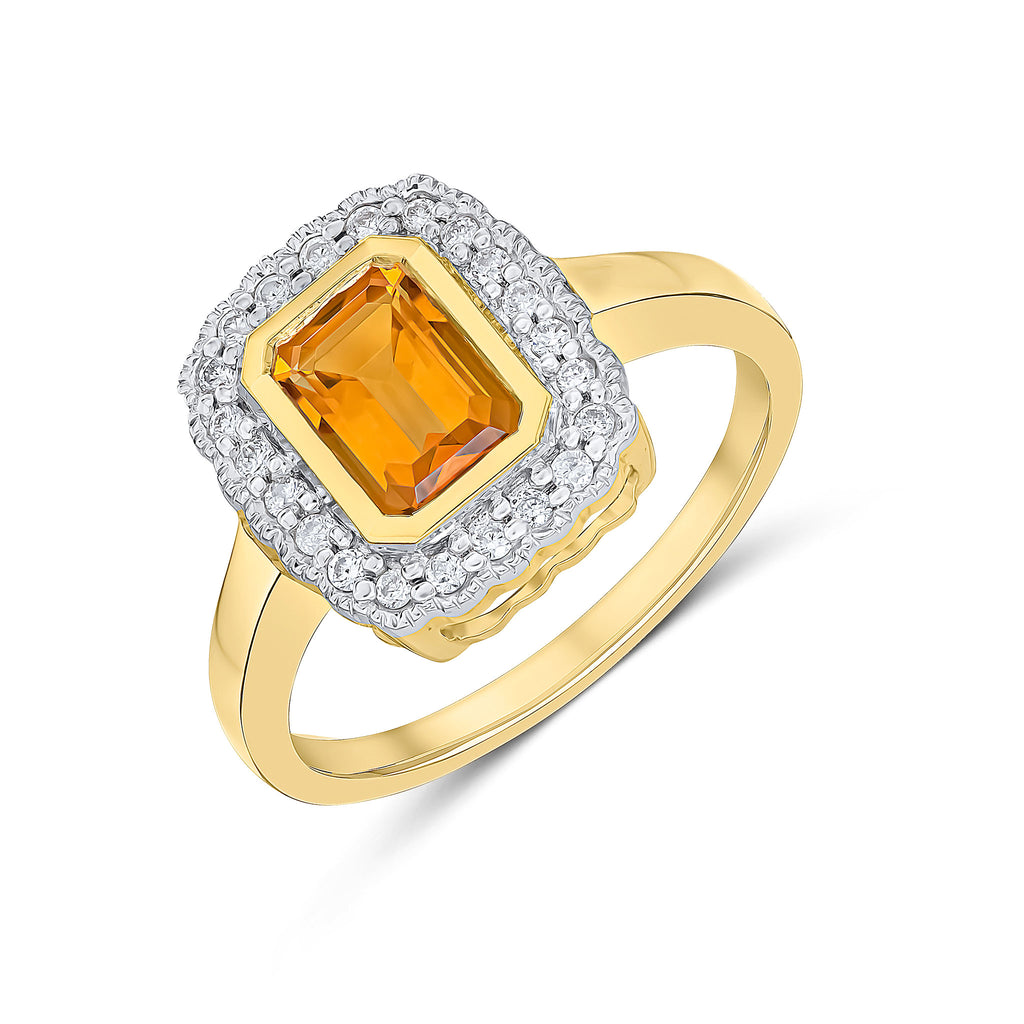 9CT Yellow Gold Octagonal Rubover Citrine & Round Diamond Grain Set Cluster Ring 7x5mm