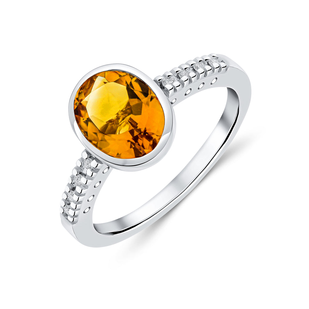 9CT White Gold Oval Rubover Citrine Ring with Diamond Shoulders 8x6mm