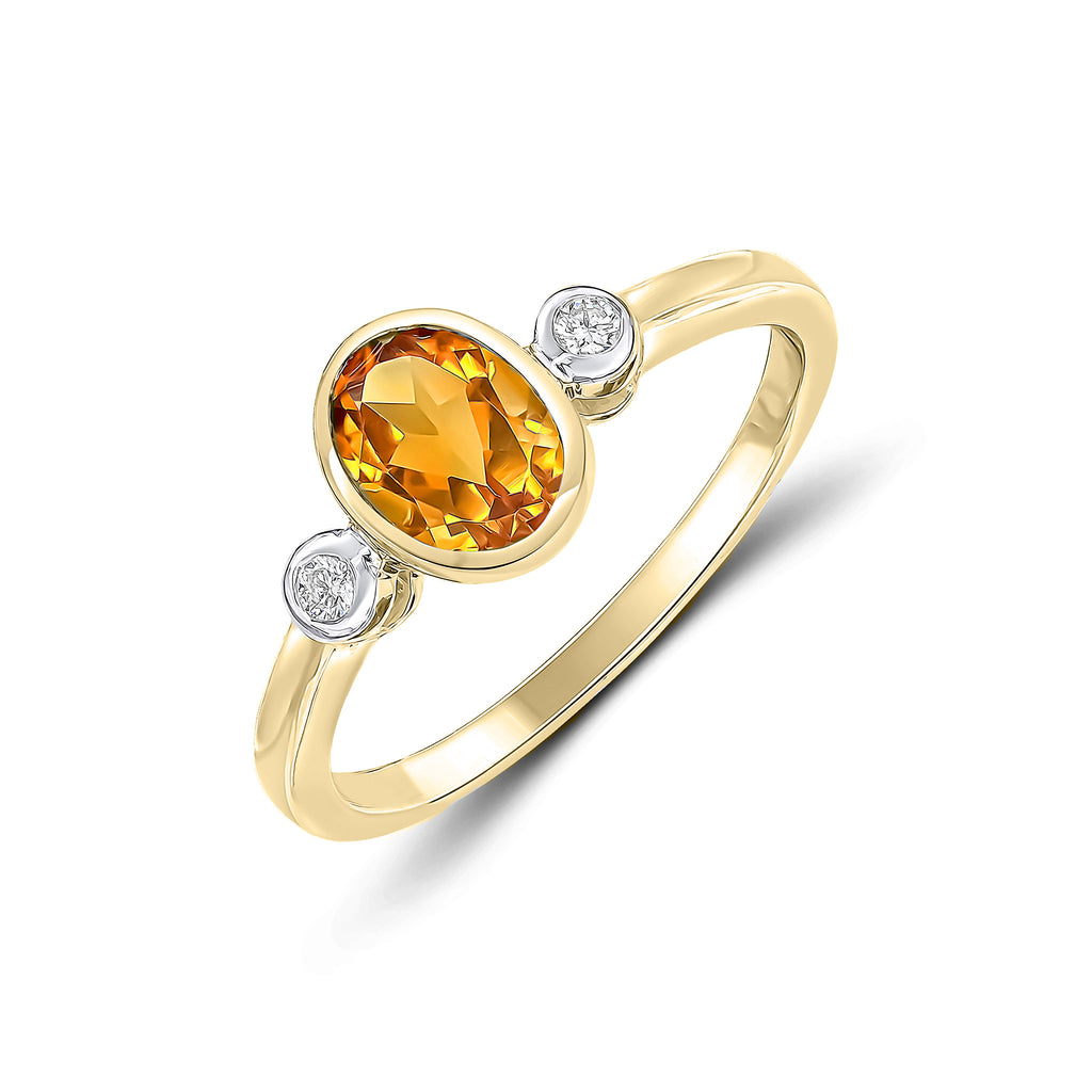 9CT Yellow Gold Oval Citrine & Diamond Three Stone Rubover Ring