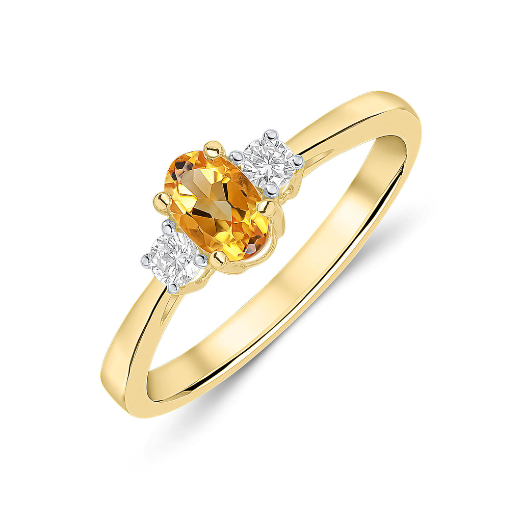 9CT Yellow Gold Oval Citrine & Round Diamond Claw Three Stone Ring 6x4mm