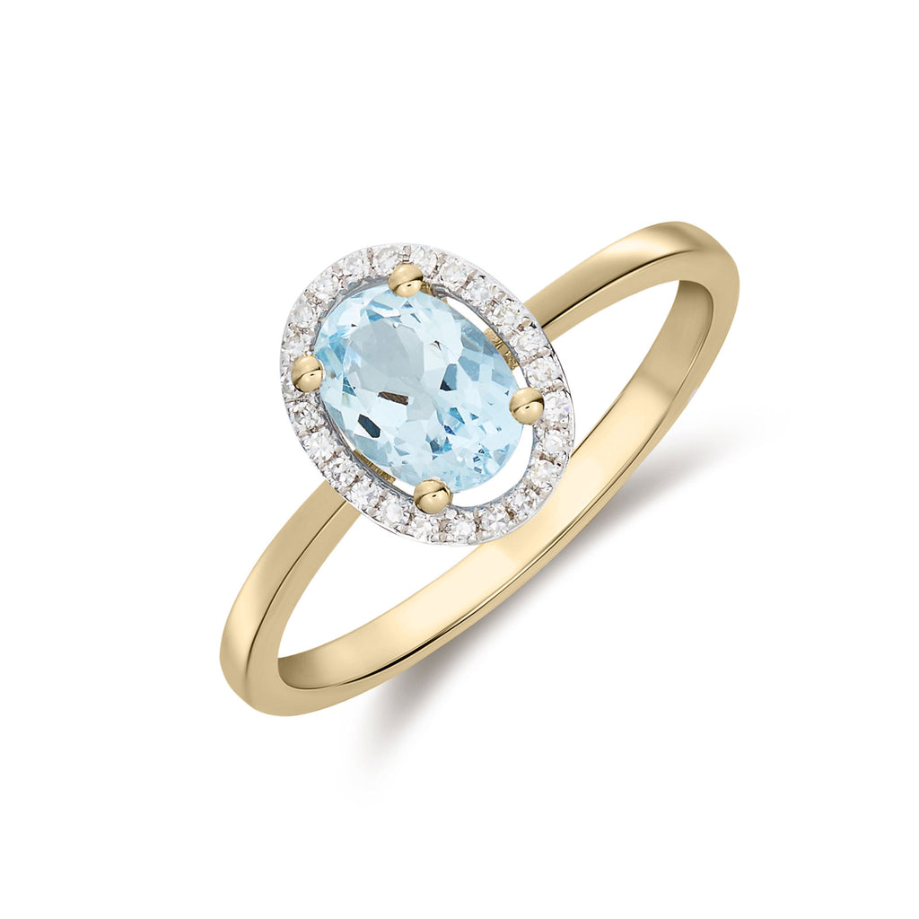 9CT Yellow Gold Oval Aquamarine & Diamond Halo Cluster Ring 7x5mm