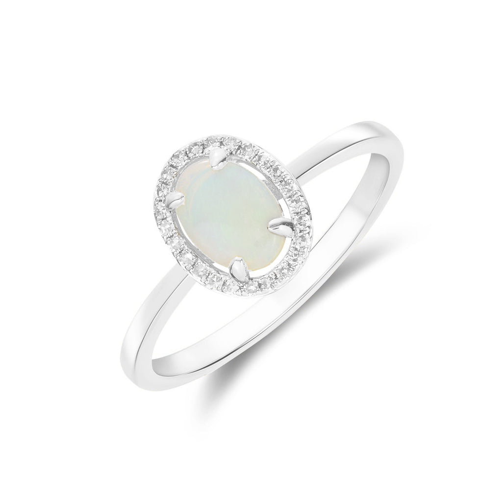 9CT White Gold Oval Opal & Diamond Halo Cluster Ring 7x5mm