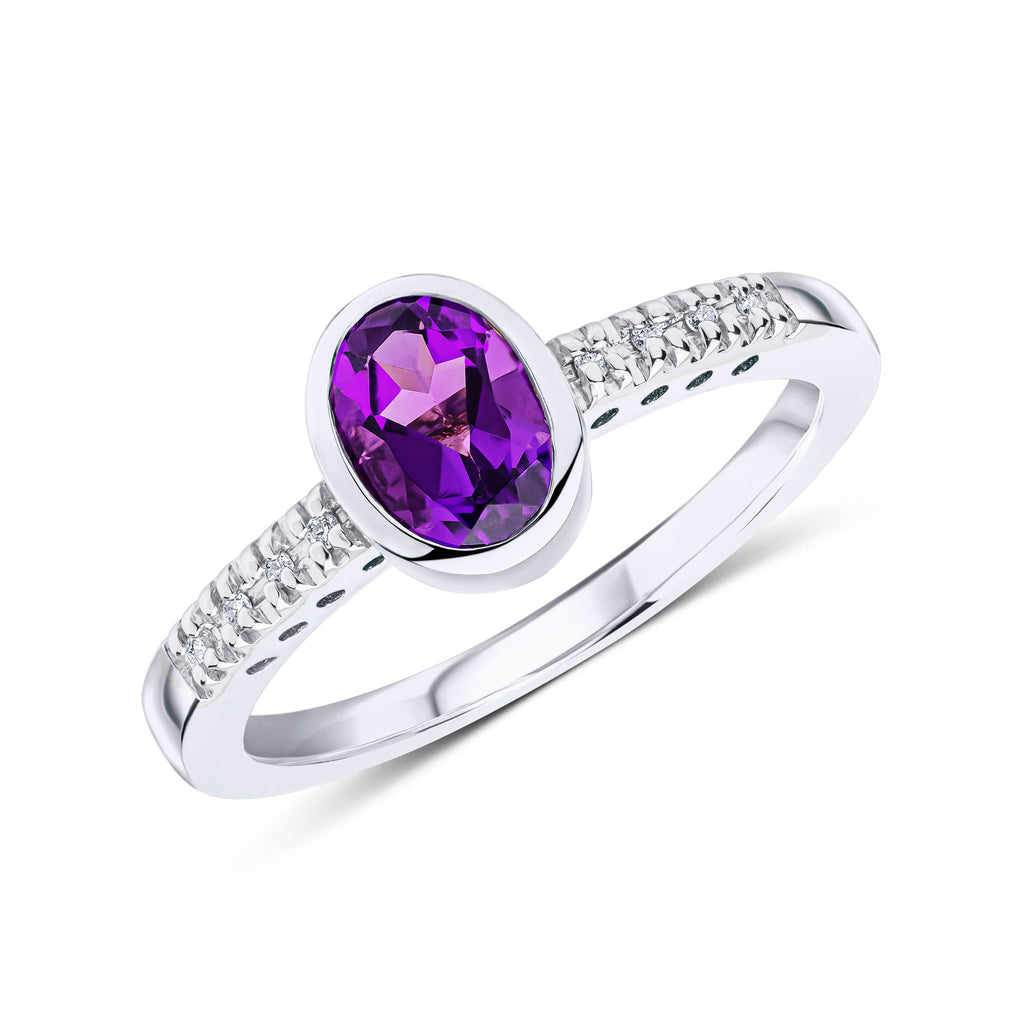 9CT White Gold Oval Amethyst & Diamond Rubover Ring 7x5mm