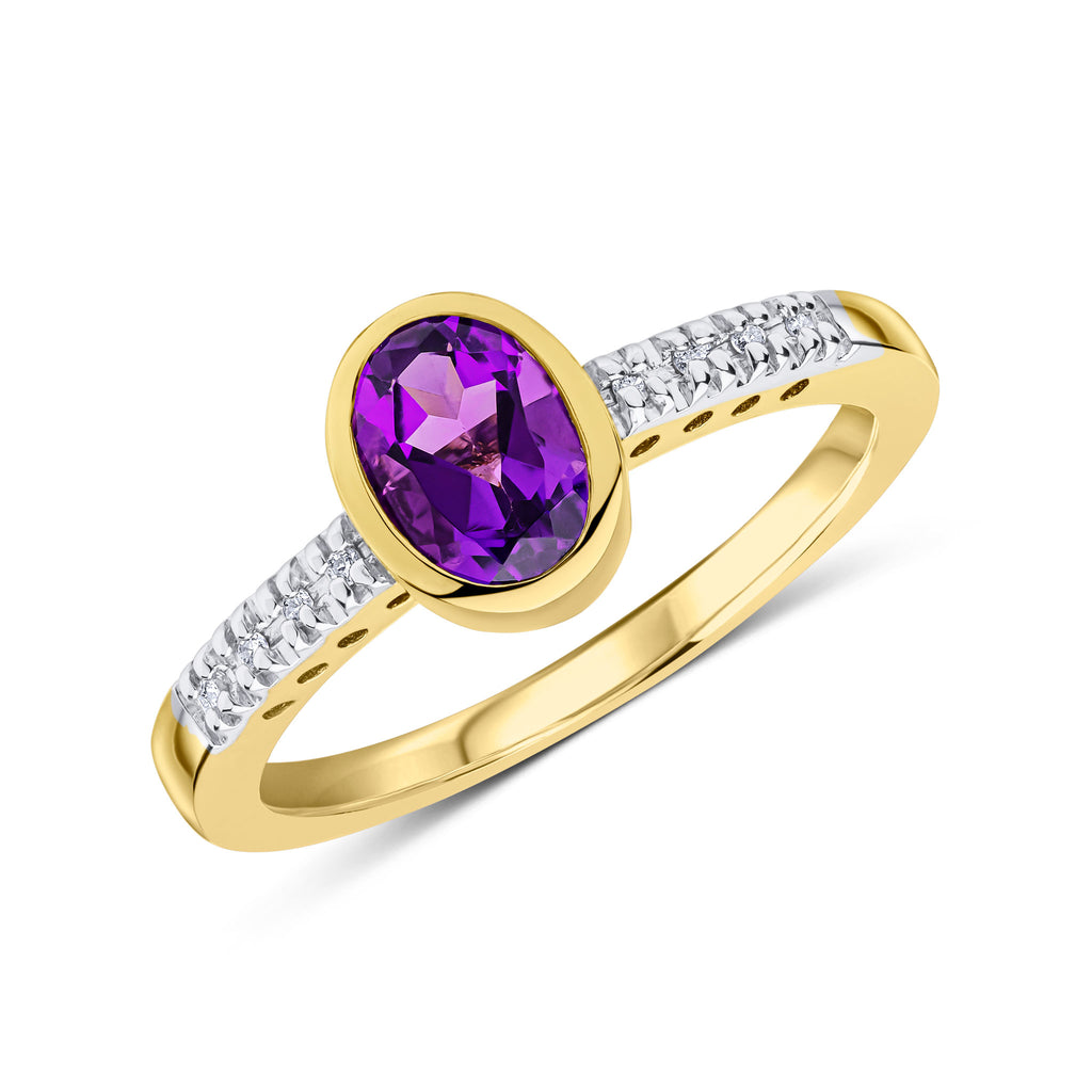 9CT Yellow Gold Oval Amethyst & Diamond Rubover Ring 7x5mm