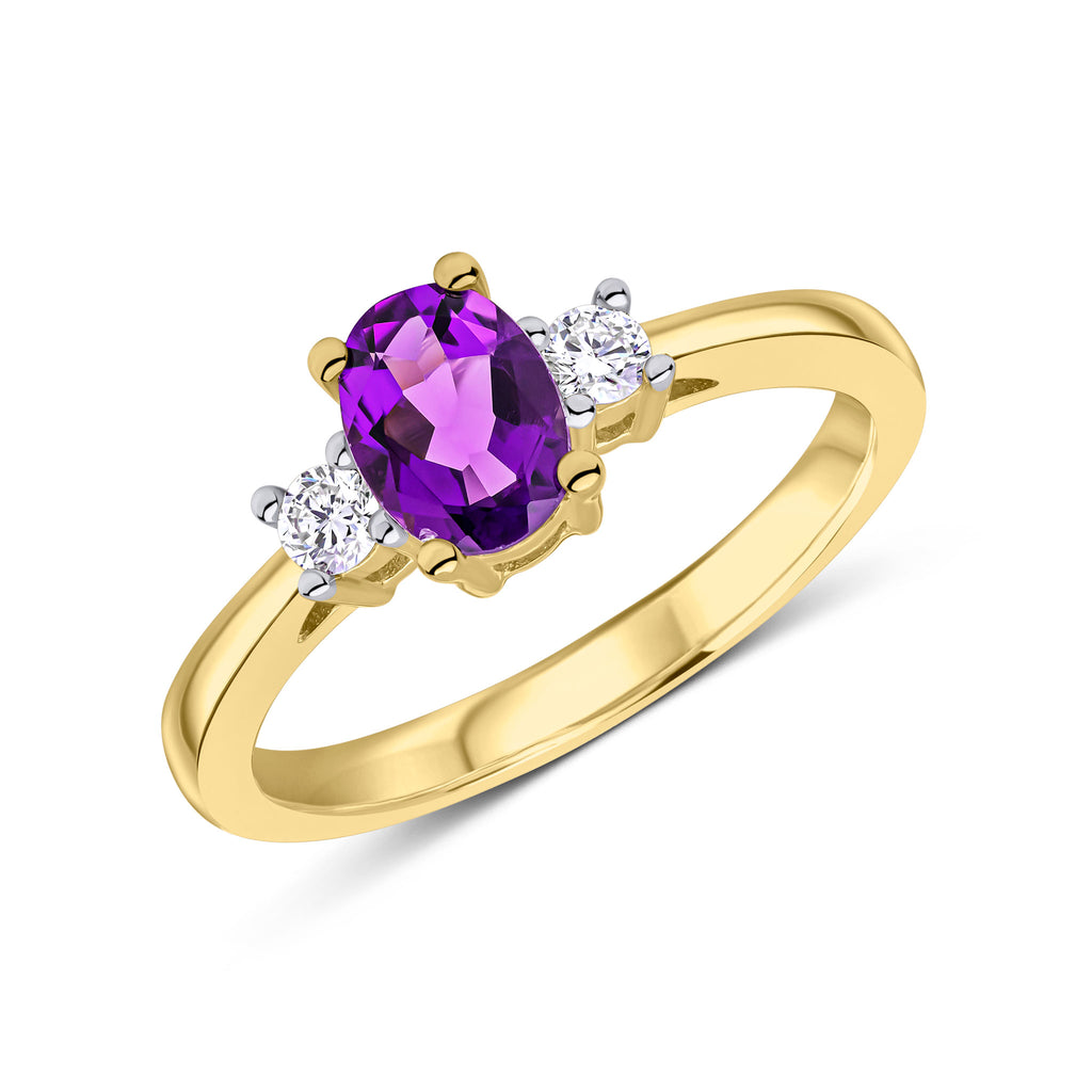 9CT Yellow Gold Oval Amethyst & Round Diamond 7x5mm Claw Set Three Stone Ring