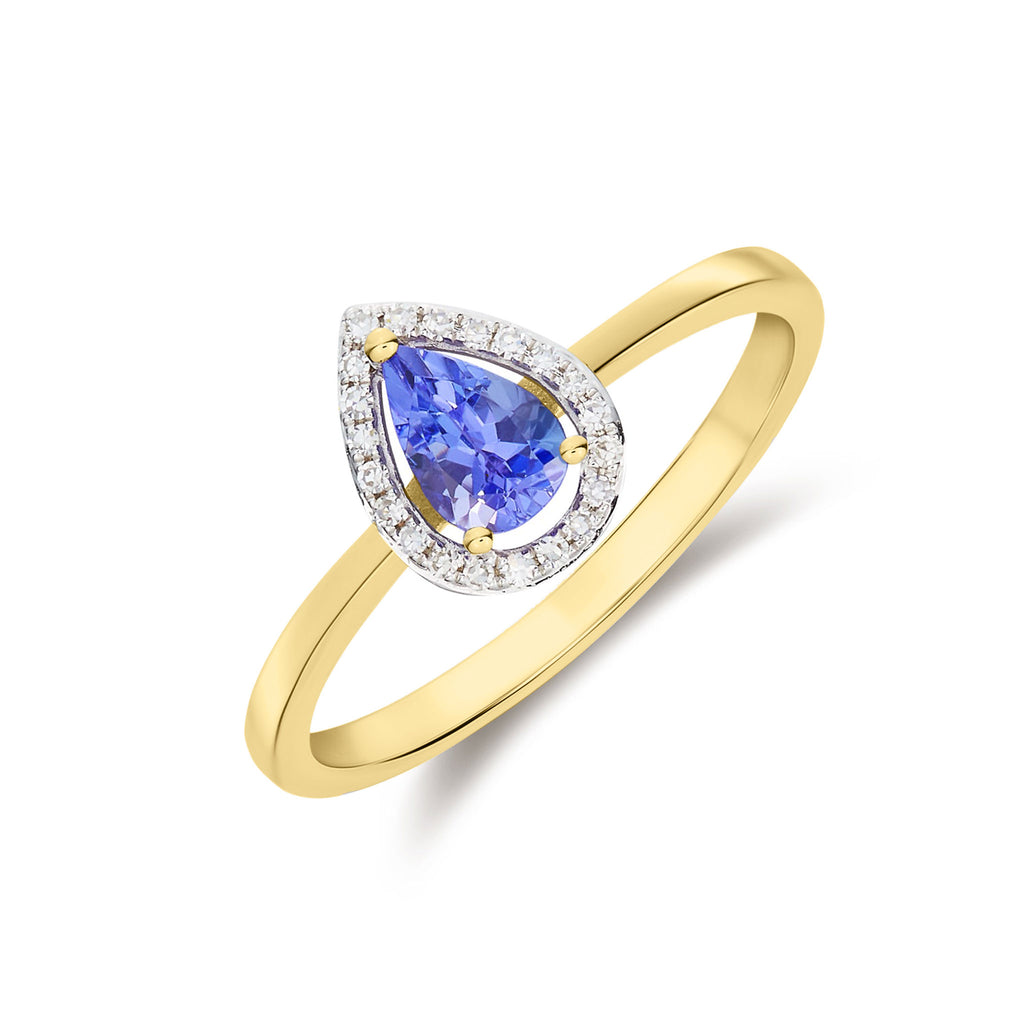 9CT Yellow Gold Pear Shaped Tanzanite & Diamond Halo Cluster Ring 6x4mm