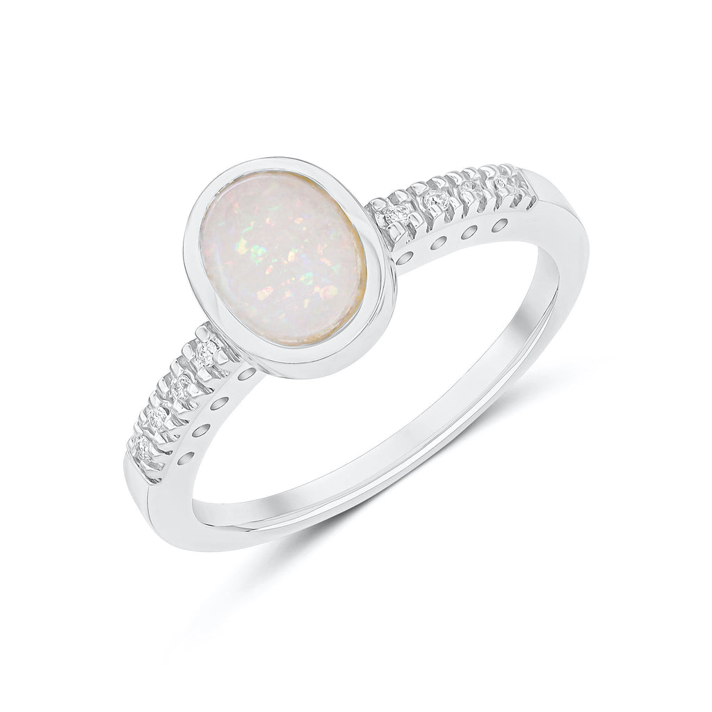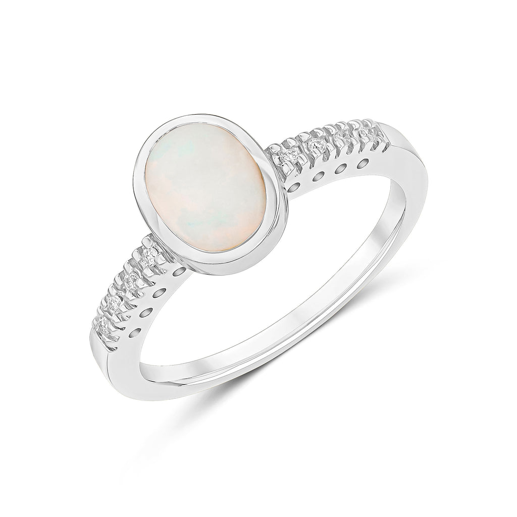 9CT White Gold Oval Rubover Opal Ring with Diamond Shoulders 8x6mm