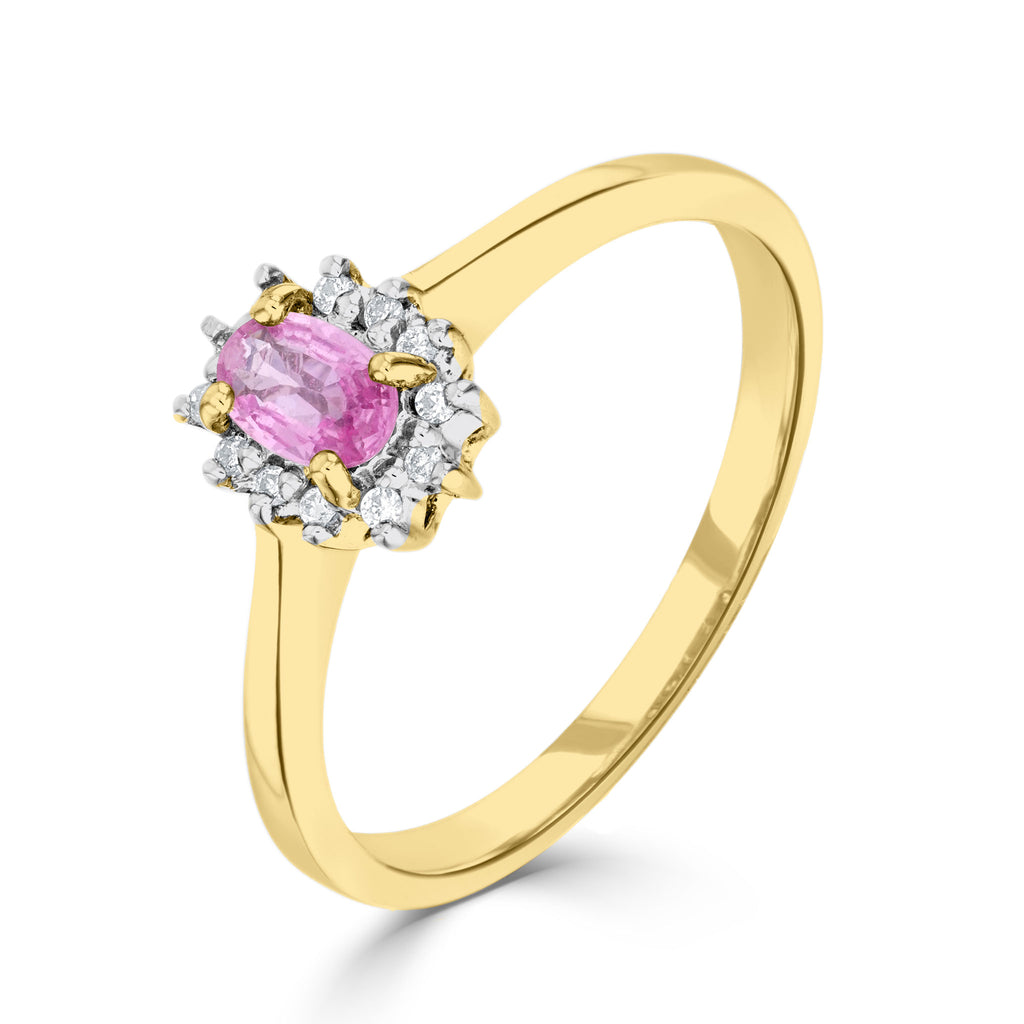 9CT Yellow Gold Oval Pink Sapphire & Diamond Cluster Ring 5x3mm