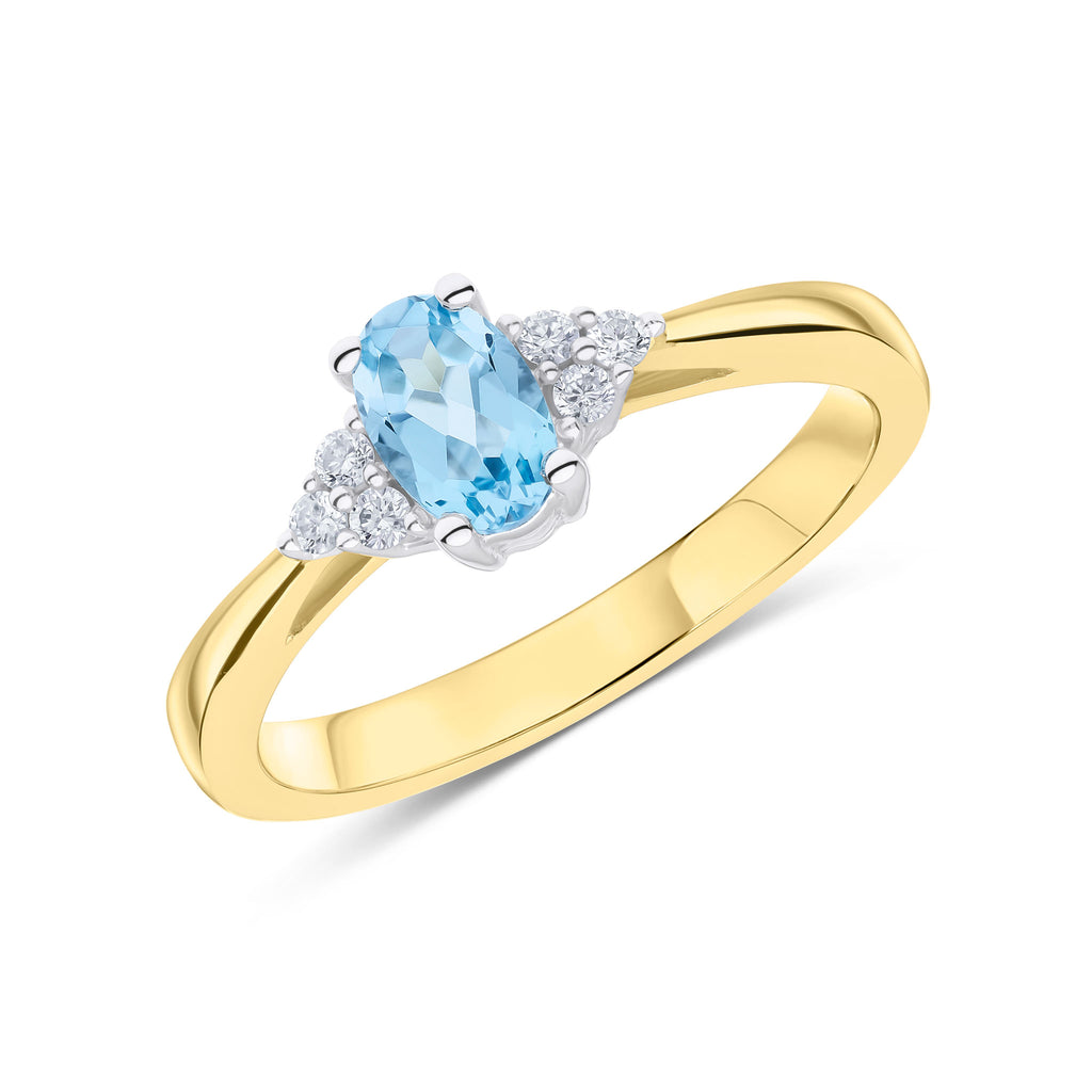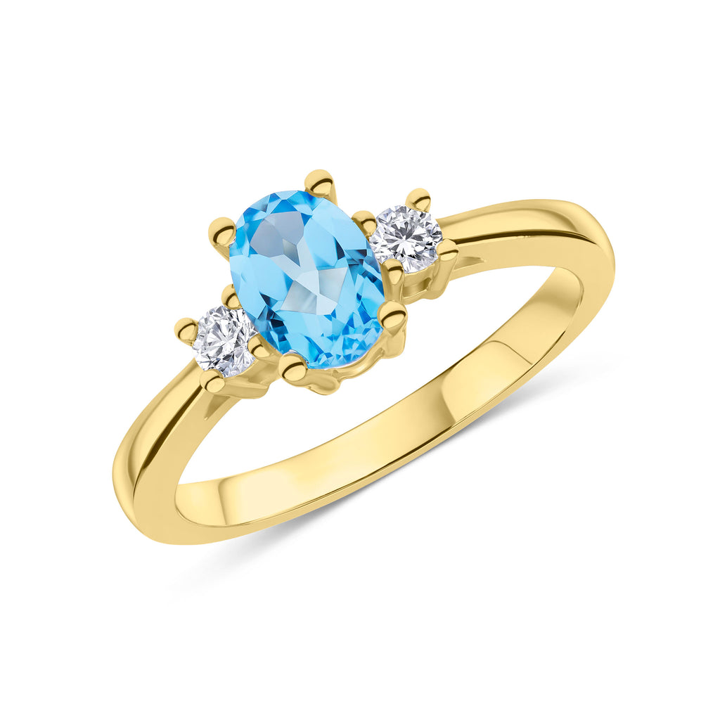 9CT Yellow Gold Oval Swiss Blue Topaz & Round Diamond Claw Set Three Stone Ring 7x5mm