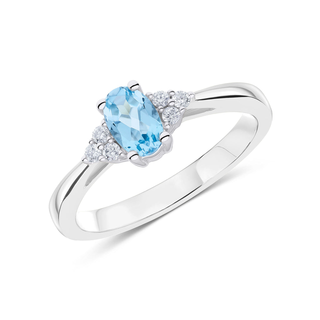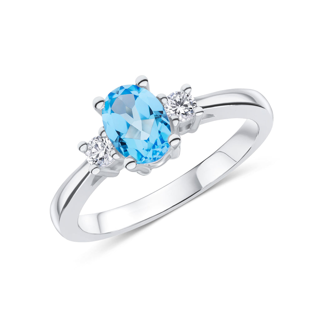 9CT White Gold Oval Swiss Blue Topaz & Round Diamond Claw Set Three Stone Ring 7x5mm