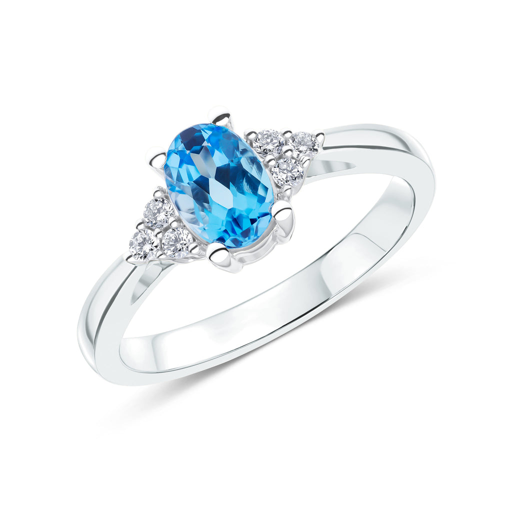 9CT White Gold Oval Swiss Blue Topaz & Diamond Trefoil Ring 6x4mm