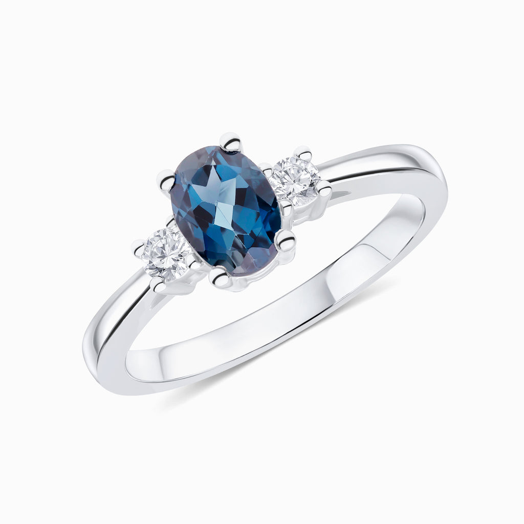 9CT White Gold Oval London Blue Topaz & Round Diamond Claw Set Three Stone Ring 7x5mm