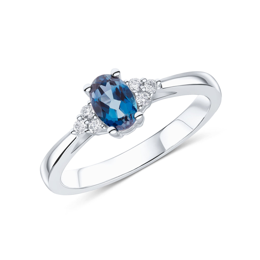 9CT White Gold Oval London Blue Topaz & Diamond Trefoil Ring 7x5mm