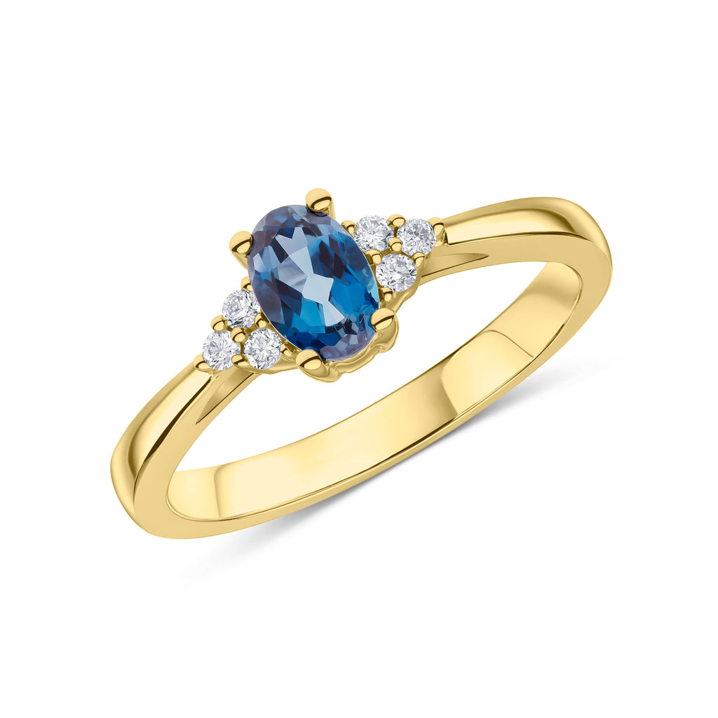 9CT Yellow Gold Oval London Blue Topaz & Round Diamond Claw Set Three Stone Ring 7x5mm
