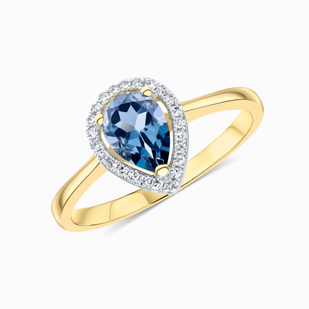 9CT Yellow Gold Pear Shaped London Blue Topaz & Diamond Halo Cluster Ring 7x5mm