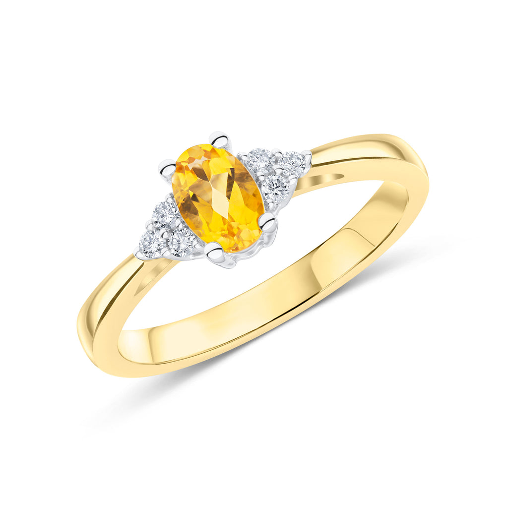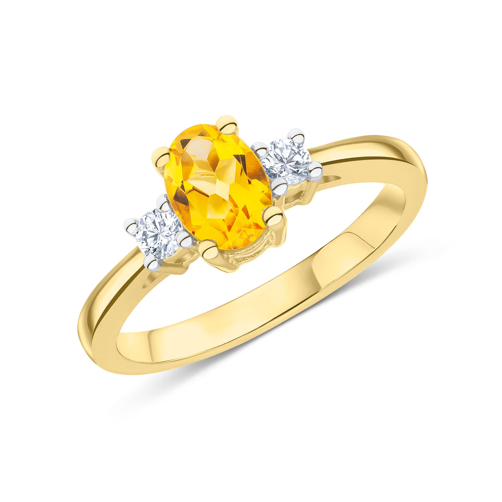 9CT Yellow Gold Oval Citrine & Round Diamond 7x5mm Claw Set Three Stone Ring