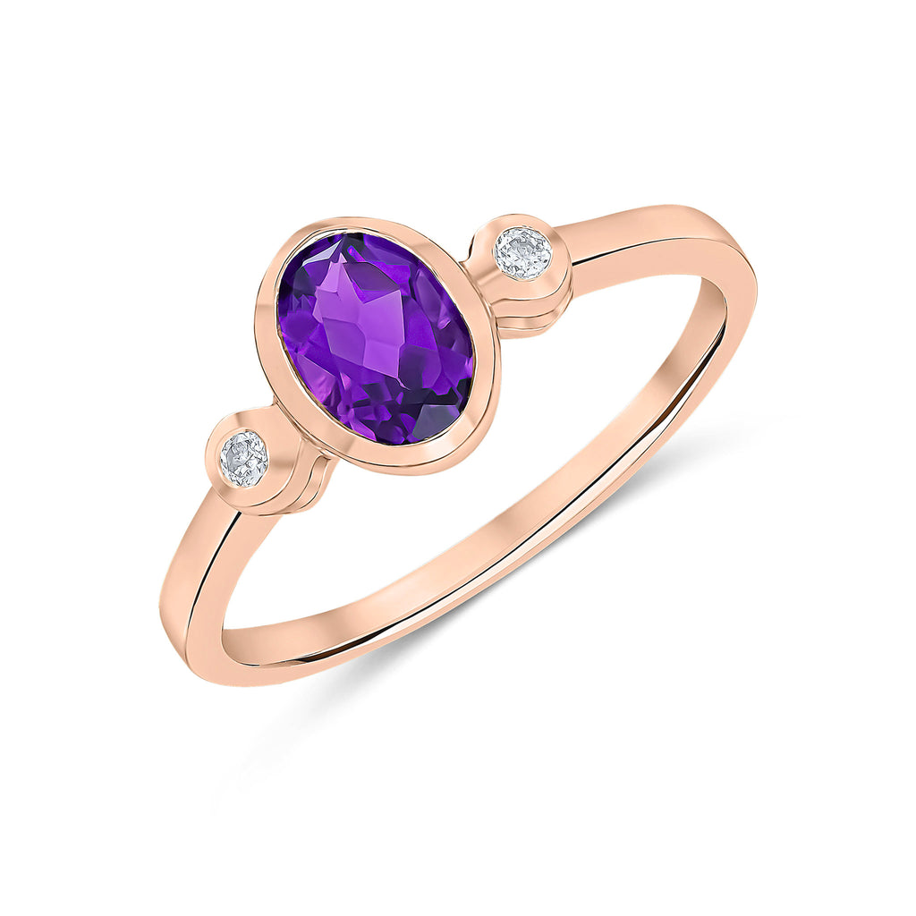 9CT Rose Gold Oval Amethyst & Round Diamond Three Stone Rubover Ring