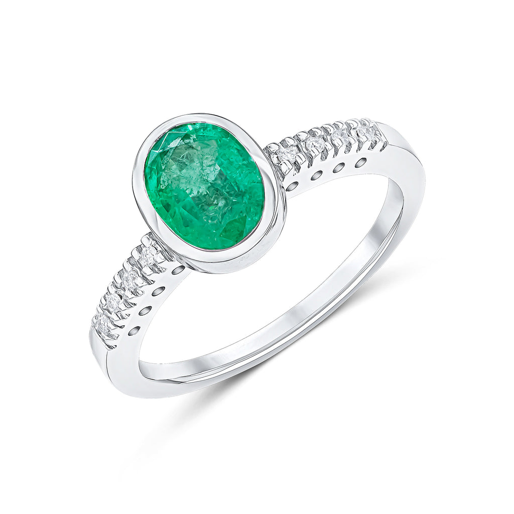 9CT White Gold Oval Rubover Emerald Ring with Diamonds Shoulders 8x6mm