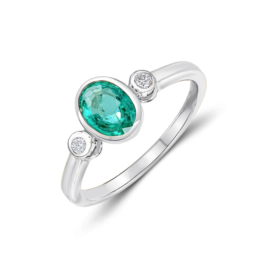 9CT White Gold Oval Emerald & Diamond Three Stone Rubover Ring