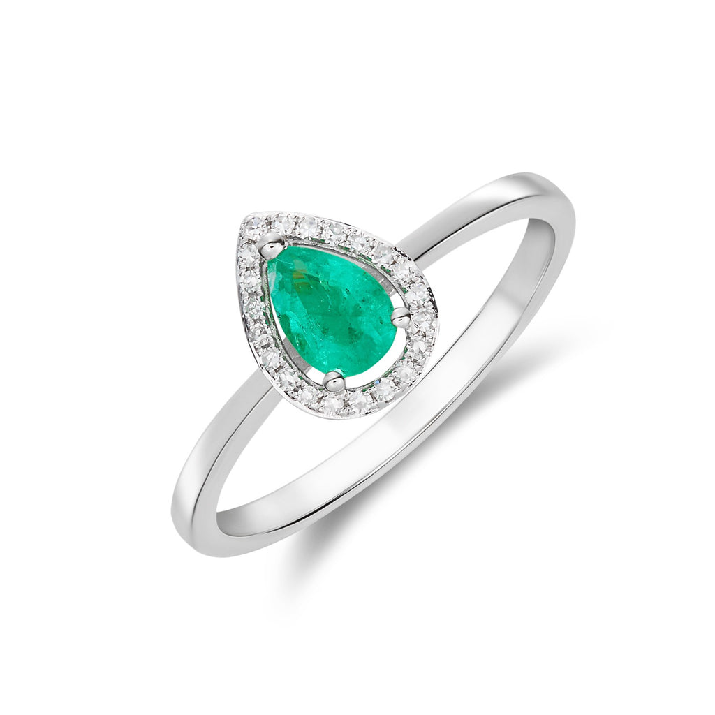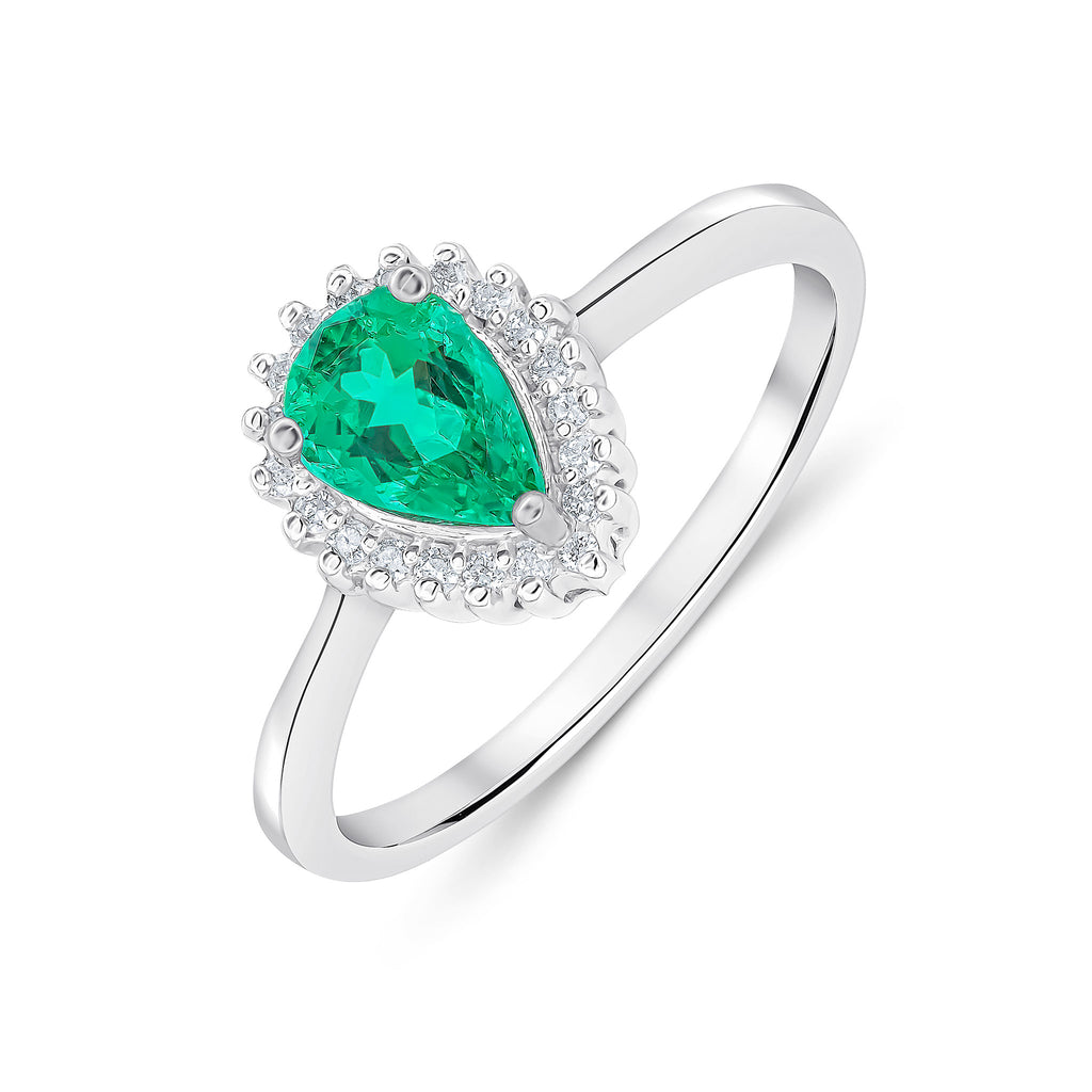 9CT White Gold Pear Shaped Emerald & Diamond Halo Cluster Ring 6x4mm