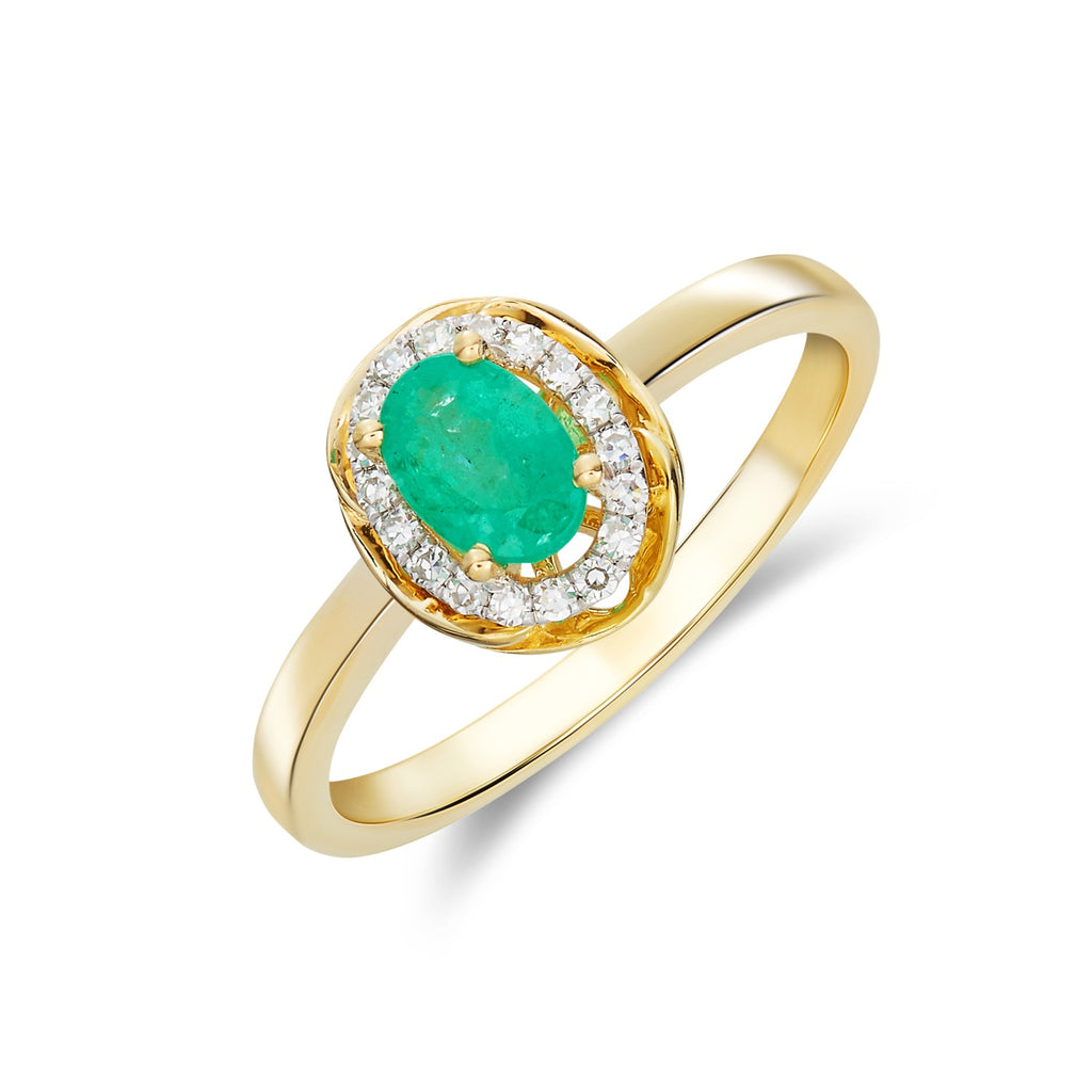 9CT Yellow Gold Oval Emerald & Diamond Cluster Ring 7x5mm