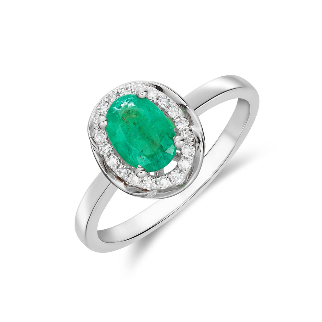 9CT White Gold Oval Emerald & Diamond Cluster Ring 7x5mm
