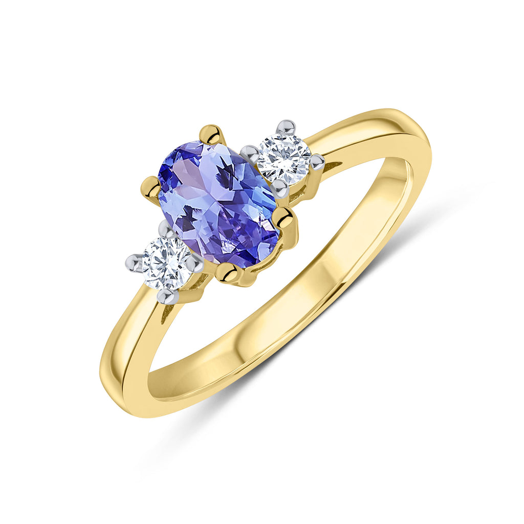 9CT Yellow Gold Oval Tanzanite & Round Diamond Claw Set Three Stone Ring 7x5mm