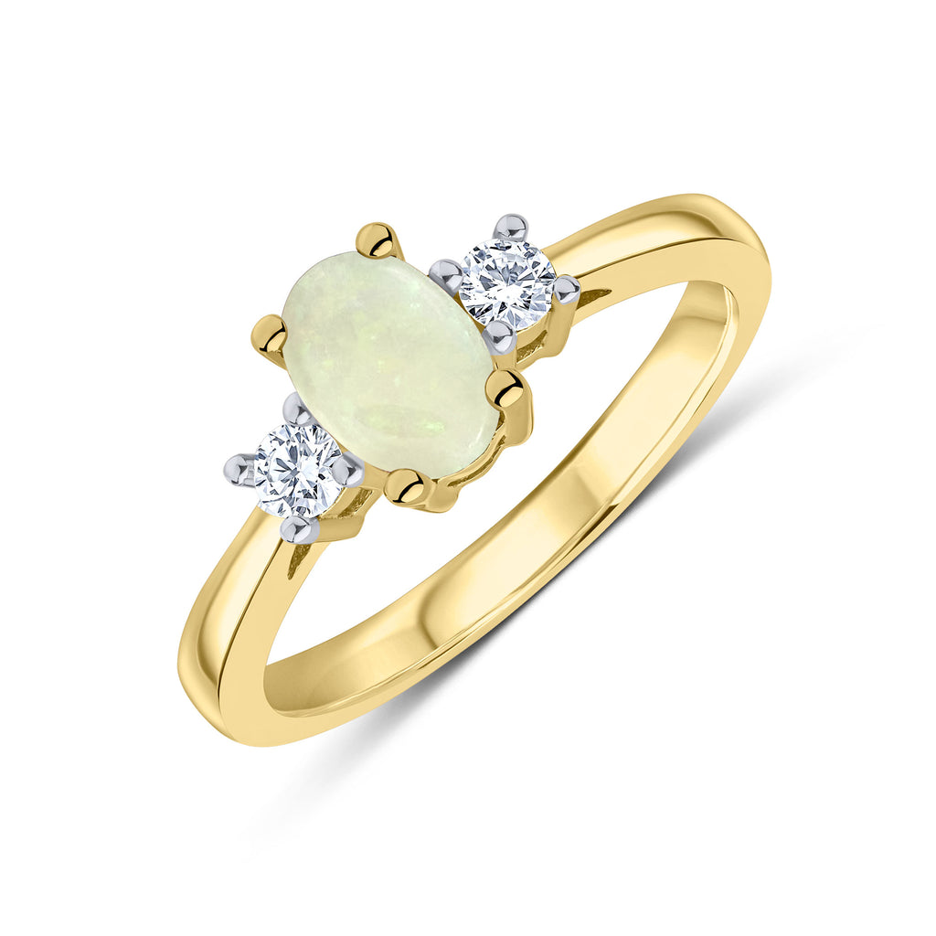9CT Yellow Gold Oval Opal & Round Diamond Claw Set Three Stone Ring 7x5mm
