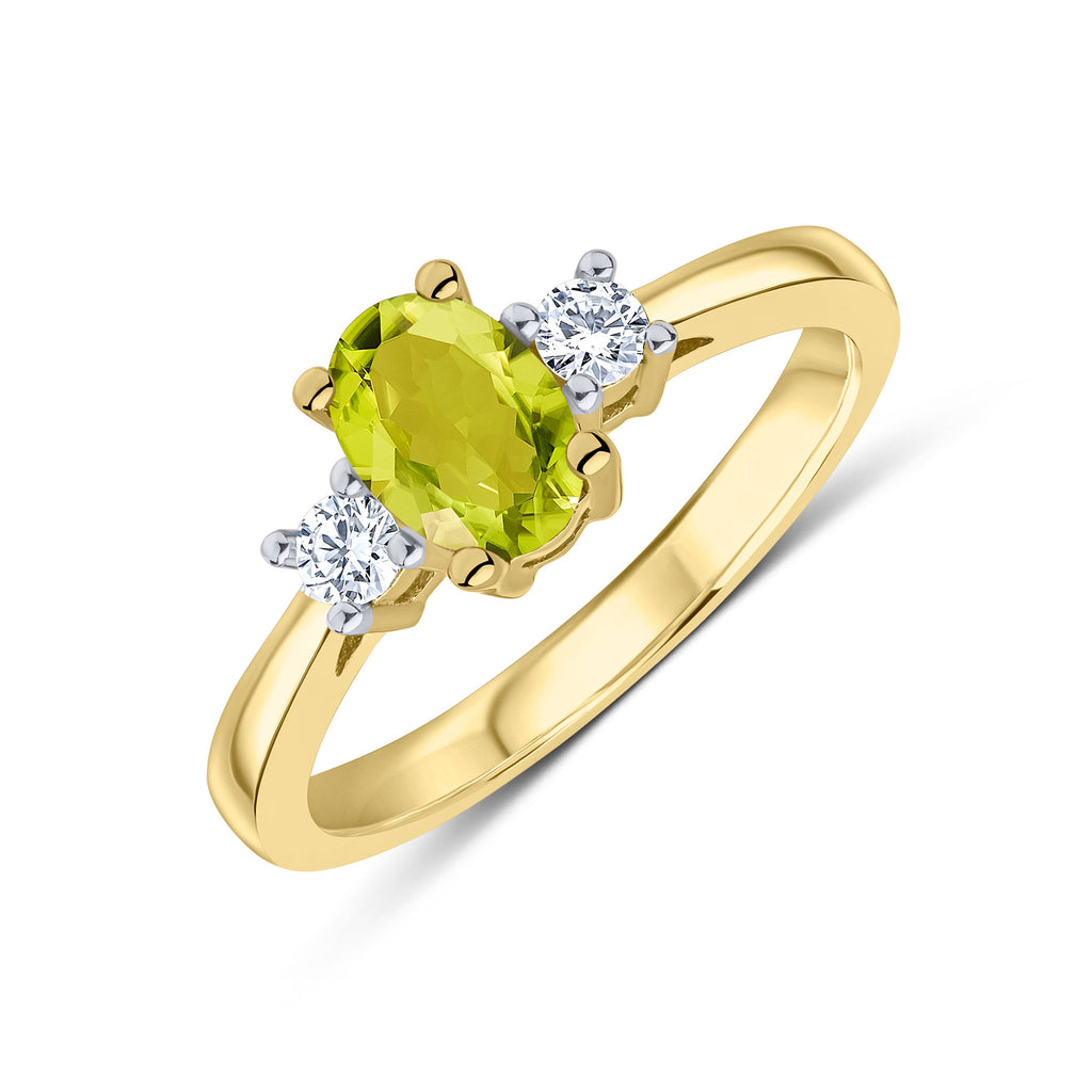 9CT Yellow Gold Oval Peridot & Round Diamond Claw Set Three Stone Ring 7x5mm