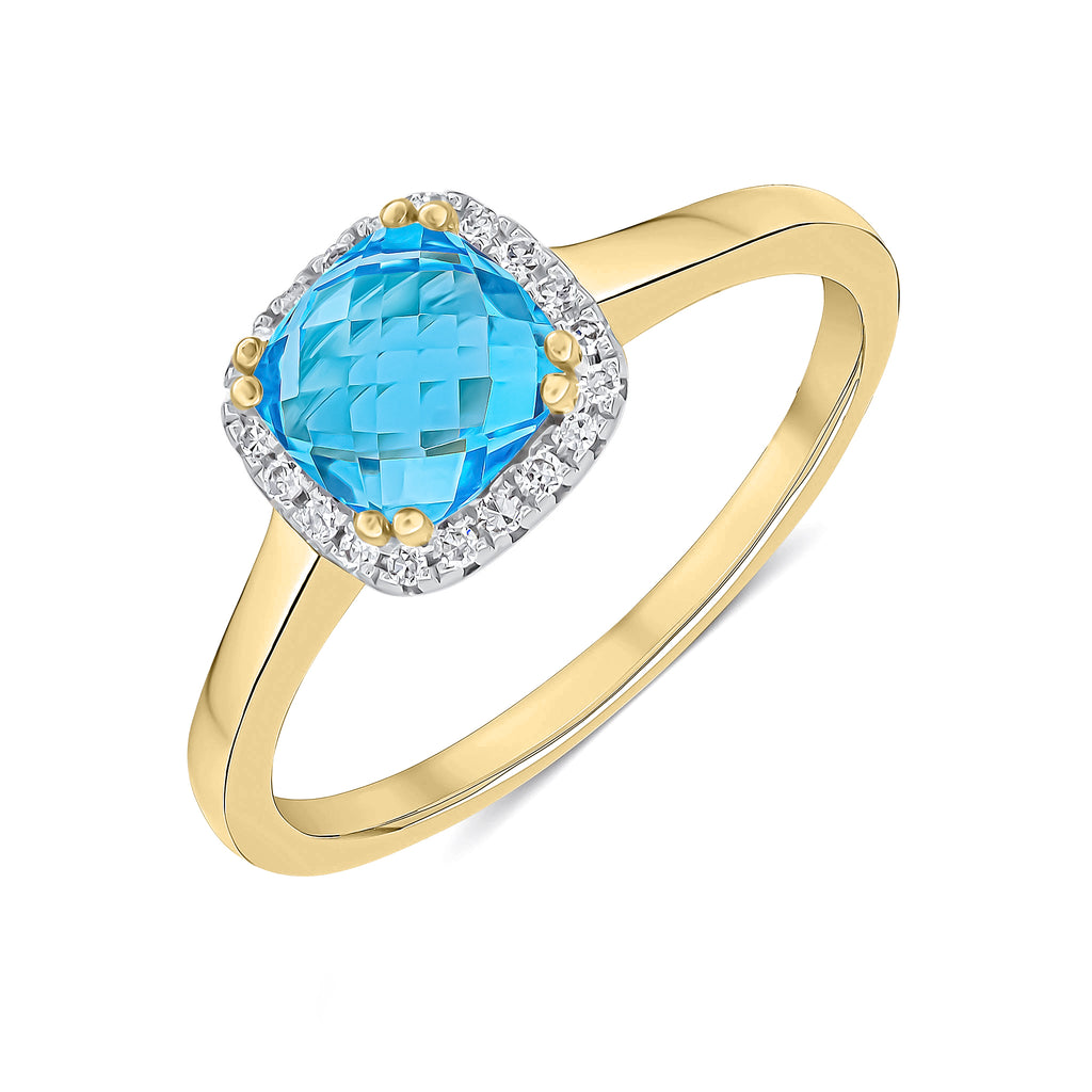 9CT Yellow Gold Checkerboard Cut Cushion Swiss Blue Topaz & Diamond Cluster Ring 6mm
