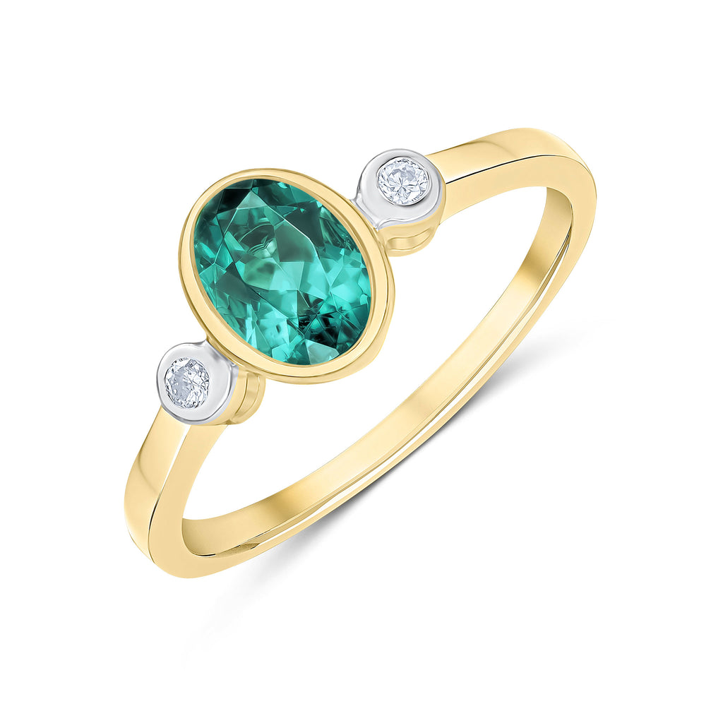 9CT Yellow Gold Oval Green Tourmaline & Round Diamond Three Stone Rubover Ring