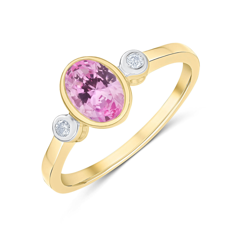 9CT Yellow Gold Oval Pink Tourmaline & Round Diamond Three Stone Rubover Ring
